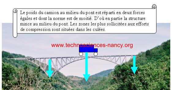 En effet, lors des études précédentes au sujet de la répartition des efforts sur les poteaux en fonction du déplacement d’une masse le long d’un linteau, on a pu expliquer le rôle des culées dans un pont. Il est nécessaire de renforcer ces deux zones car elles sont les plus sollicitées aux efforts de compression, et d’ alléger sa structure au milieu du pont. Le poids du camion au milieu est réparti en deux forces égales aux culées, et de normes divisées par deux par rapport à la norme du poids du camion. Voir la photo.